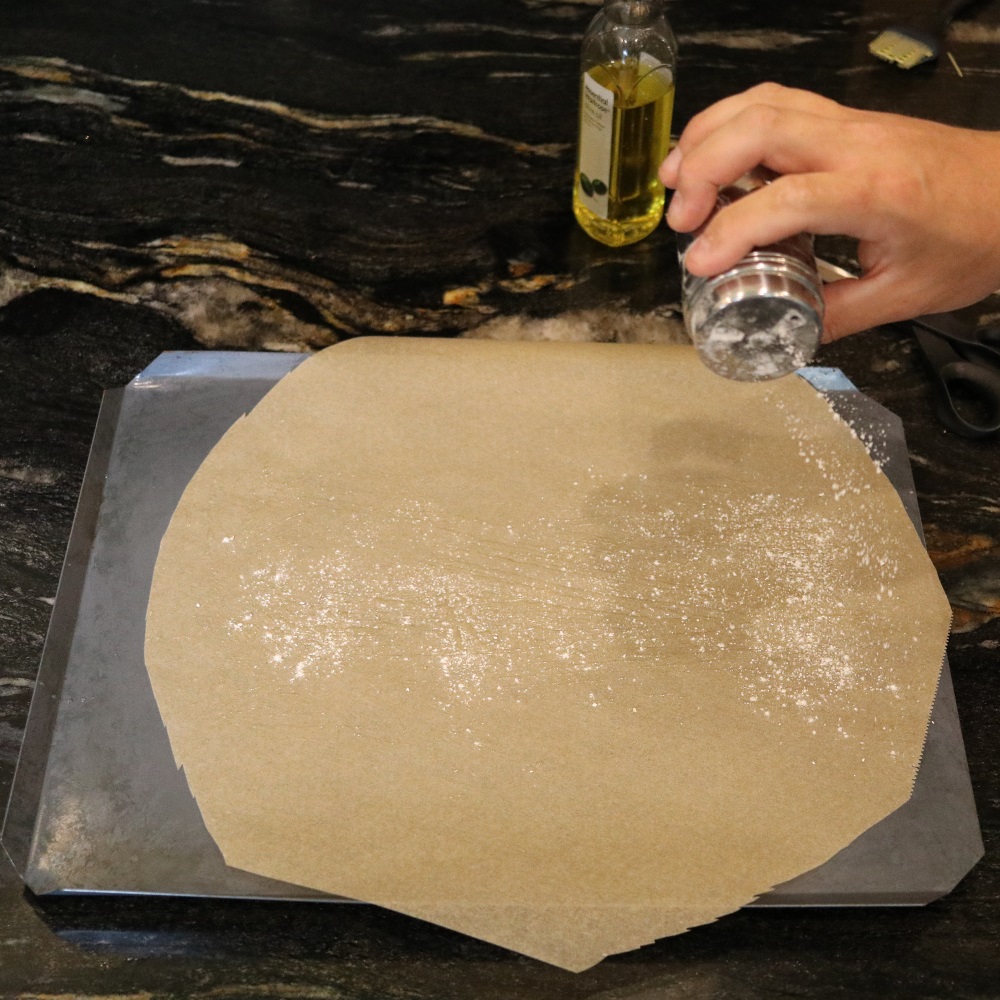 Then slide the parchment from the proving tray onto the pizza stone. Heat is conducted rapidly through the parchment when it touches the stone. The parchment can be removed after ten minutes, as the dough’s base will have hardened by then.