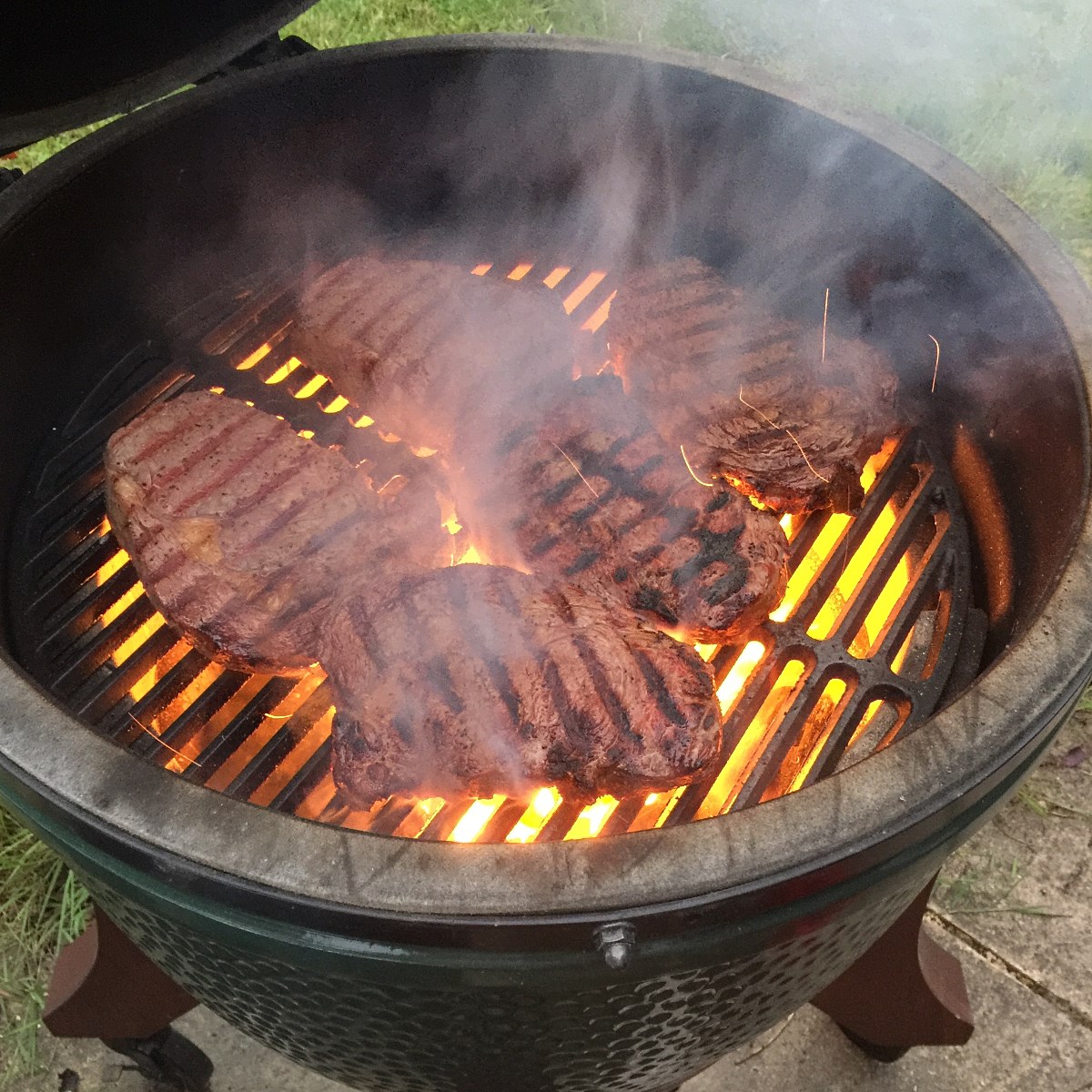 4. Once the Egg is at temperature, leave it for 10 minutes to get some heat into the grid. Keep the temperature constant. Then burp and open the dome and lay the rib eyes on the grid. Close the dome for two minutes.