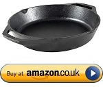 I use a cast iron pan for roasting potatoes (and other items) in the Egg. There are a variety of brands available, the most notable being Lodge. The 10.25 inch Lodge skillet is perfect for roasting potatoes for up to four people. This is available on amazon.co.uk (affiliate link). You can of course use non-cast iron in a Big Green Egg, e.g. ceramic. The precursor to the Lodge skillet was a John Lewis lasagne dish.