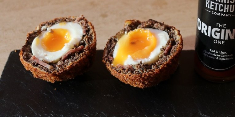 The rustic pub scotch egg, when made using Cumberland sausage infused with black pudding, has a few of the ingredients for a traditional English breakfast.